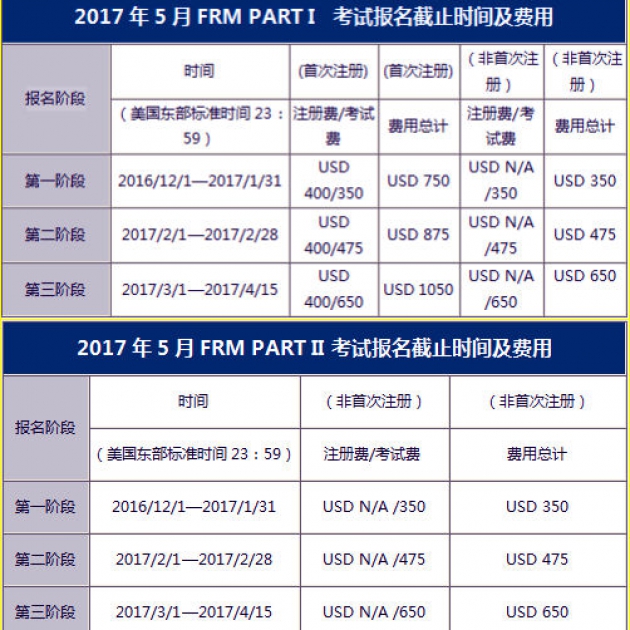 最近不少同学来向FRM小编咨询关于2017年FRM考试的问题,官网公布了消息,FRM小编来给大家介绍一下。 2017年FRM考试报名时间费用 FRM考试每年考试时间为5月和11月的第三个周六。考生可以