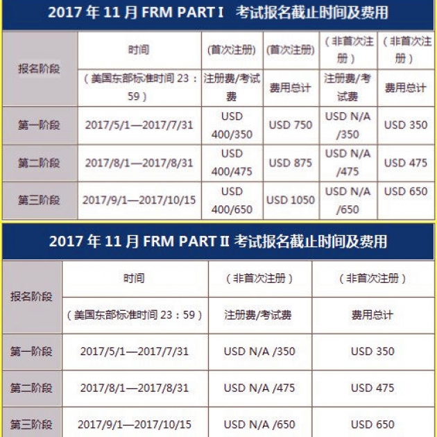 GARP协会官网公布了2017年的考试时间。根据FRM考试协会从施行分级考试后的规定,将每年的考试都设在了5月和11月第三个周六。 2017年FRM考试时间分别为: 2017年上半年FRM考试时间在5月