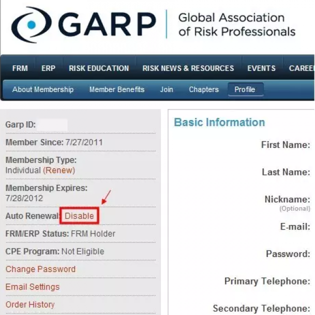 考完FRM一二级之后,信用卡被扣了195美金会员费,不知道是怎么回事? 答:在注册报名时,自动成为GARP协会会员,考试后仍为自动会员,每年将扣会费195美金。 如何禁用协会自动更新您的会员,避免被扣FRM会费? 第一步,登录GARP协会FRM官网 第二步骤:输入您