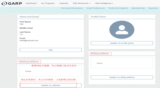 FRM个人信息的填写必须详细,如果个人地址填写不全导致无法邮寄,FRM协会回收回证书,而我们需要再进行申请才可以获得。